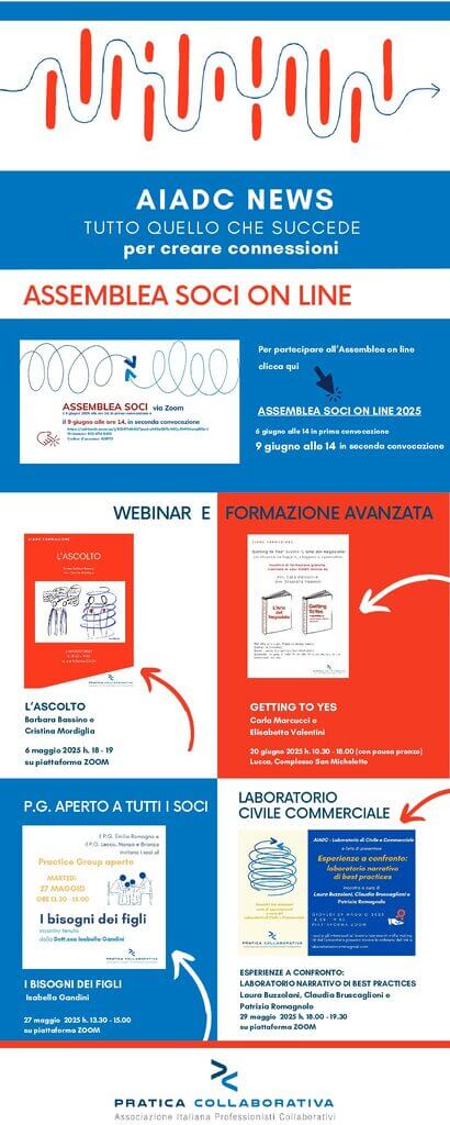AIADC – Associazione Italiana Professionisti Collaborativi – è un’associazione di professionisti formati al metodo della Pratica Collaborativa: avvocati, commercialisti, mediatori, esperti delle relazioni, psicologi ed esperti dell’età evolutiva.
