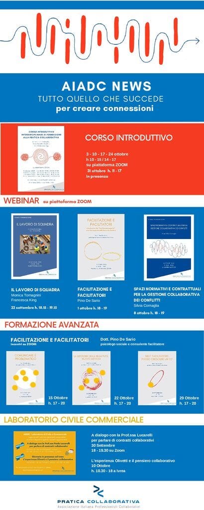 AIADC – Associazione Italiana Professionisti Collaborativi – è un’associazione di professionisti formati al metodo della Pratica Collaborativa: avvocati, commercialisti, mediatori, esperti delle relazioni, psicologi ed esperti dell’età evolutiva.