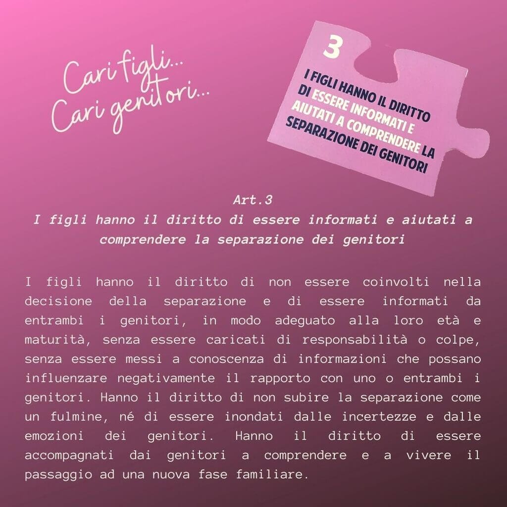 Articolo 3. I figli hanno il diritto di essere informati e aiutati a comprendere la separazione dei genitori.