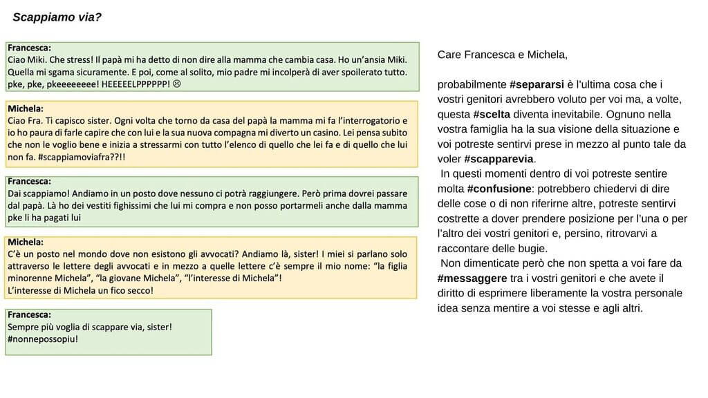I figli hanno il diritto di non essere strumentalizzati, di non essere messaggeri di comunicazioni e richieste esplicite o implicite rivolte all’altro genitore. I figli hanno il diritto di non essere indotti a mentire e di non essere coinvolti nelle menzogne.