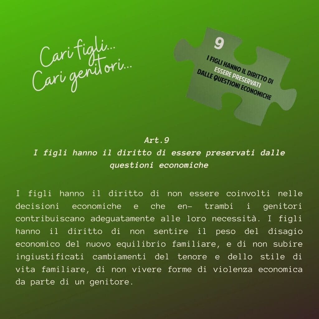 I figli hanno il diritto di non essere coinvolti nelle decisioni economiche e che entrambi i genitori contribuiscano adeguatamente alle loro necessità. I figli hanno il diritto di non sentire il peso del disagio economico del nuovo equilibrio familiare, e di non subire ingiustificati cambiamenti del tenore e dello stile di vita familiare, di non vivere forme di violenza economica da parte di un genitore.