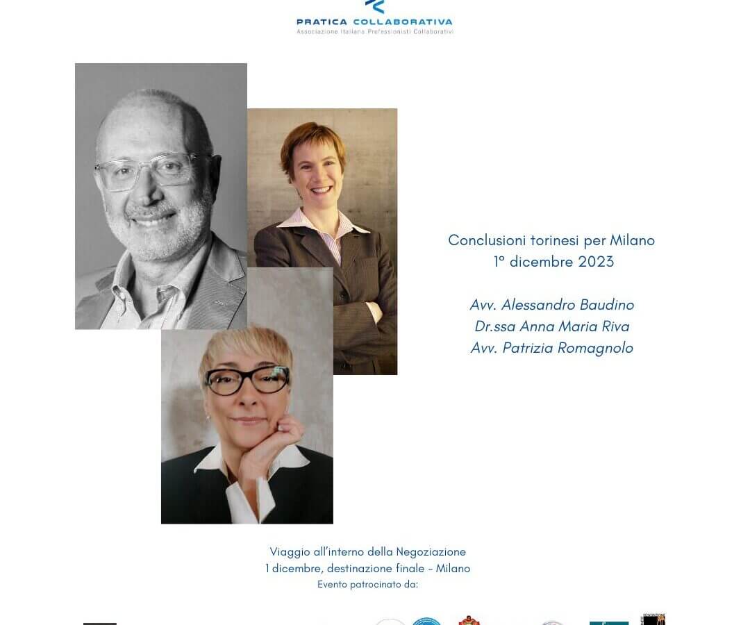 La tappa torinese ha poi guardato al futuro e fatto un passo ulteriore mettendo insieme tutte e tre le parole chiave. Si sono poste le basi per un progetto formativo di rete volto alla collaborazione sostenibile, cioè un percorso formativo per tutti i professionisti, per imparare insieme a negoziare con le basi della pratica collaborativa.