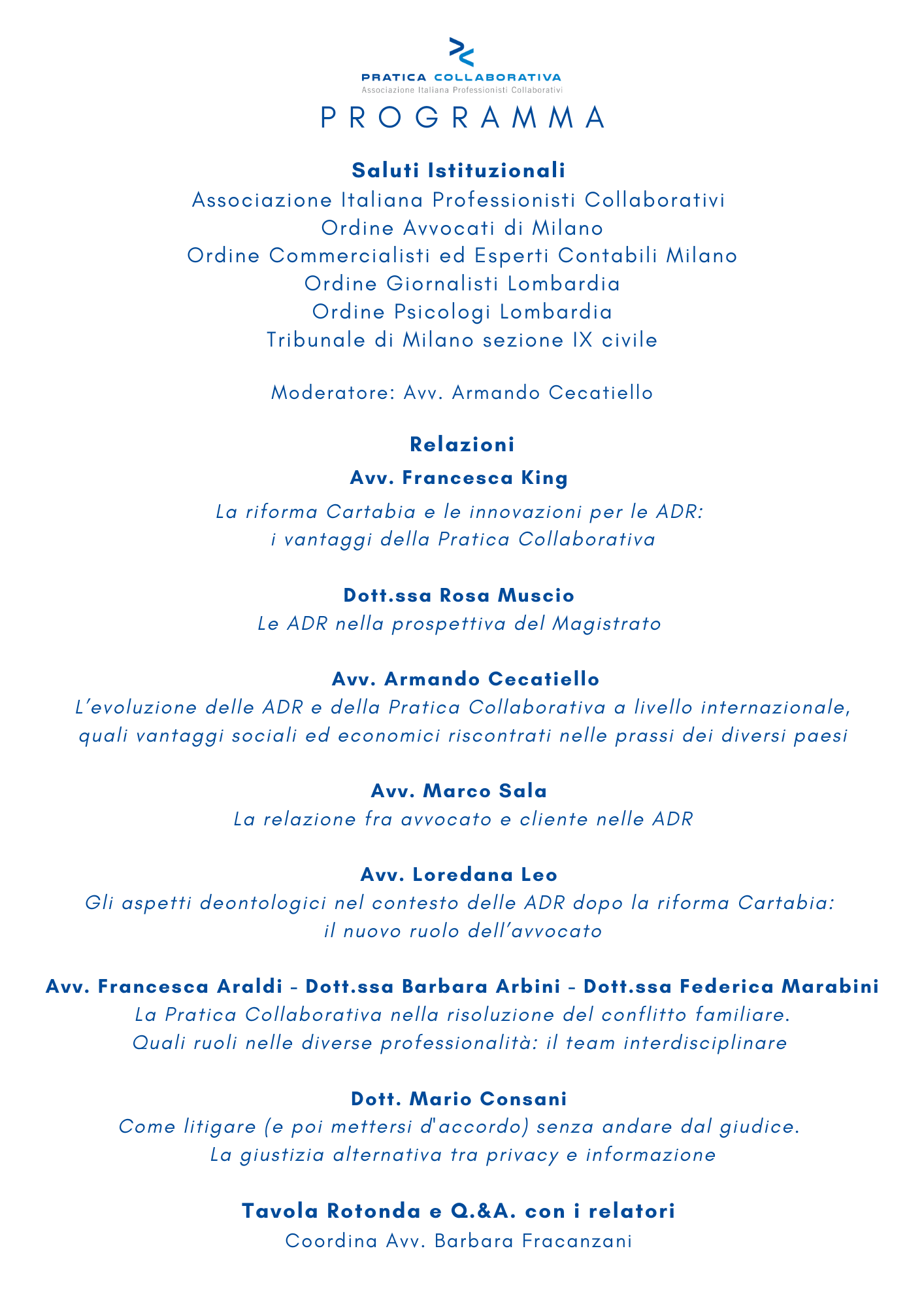 Per le iscrizioni scrivere a info@praticacollaborativa.it indicando nome, cognome, codice fiscale ed Ordine di appartenenza.