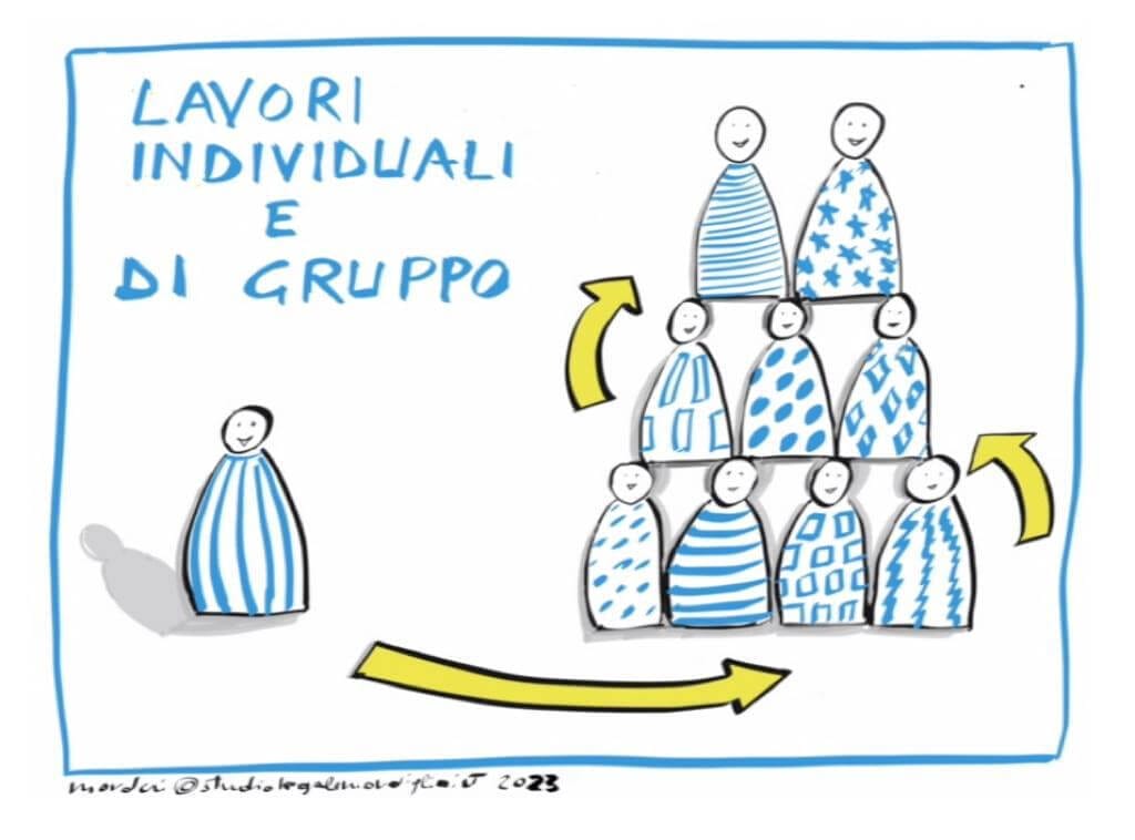 Tutti gli elementi della piramide sono utili e indispensabili; non vi è alcuna differenza tra chi viene sostenuto, e sale quindi più in alto magari esponendosi pubblicamente nel restituire la relazione finale, e chi quei contenuti contribuisce a costruirli, reggendo altre persone sulle sue spalle: tutti danno il loro apporto, compiono uno sforzo, ne traggono benefici in termini di attenzione, relazione, apprendimento e allenamento.