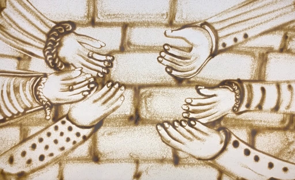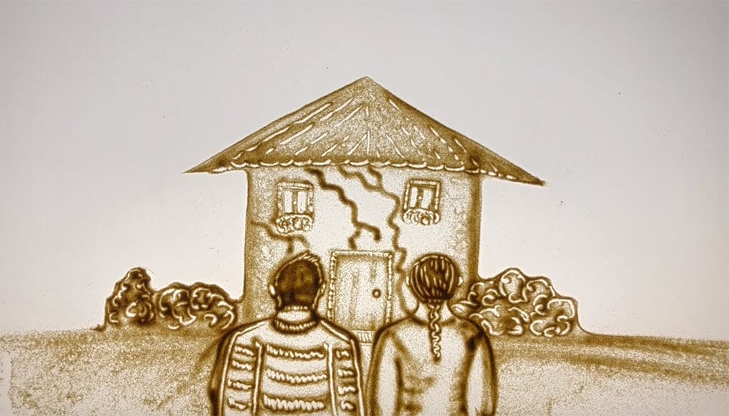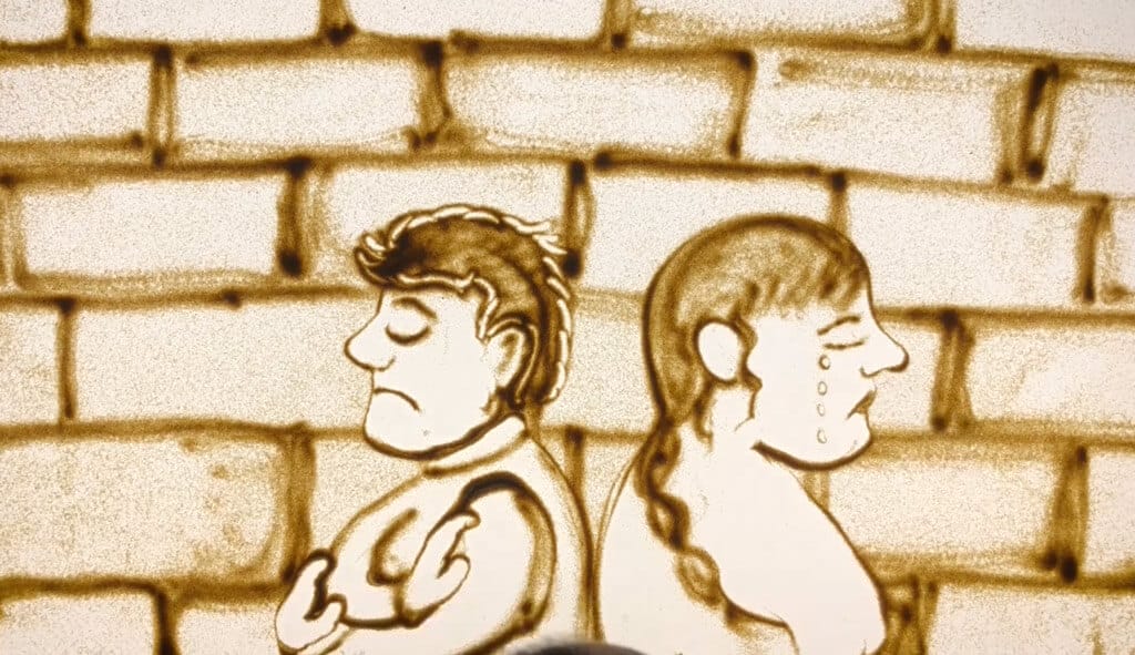 Abbiamo individuato un’artista della sabbia e, dopo qualche settimana di lavoro, le abbiamo consegnato lo storyboard e le parole del racconto a due voci, una maschile ed una femminile, per rappresentare con la sabbia la storia da noi pensata che in soli due minuti cerca di trasmettere il significato di ciò che accade in un contesto di crisi di coppia e di spiegare il fine che si propone la Pratica Collaborativa.